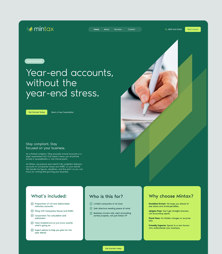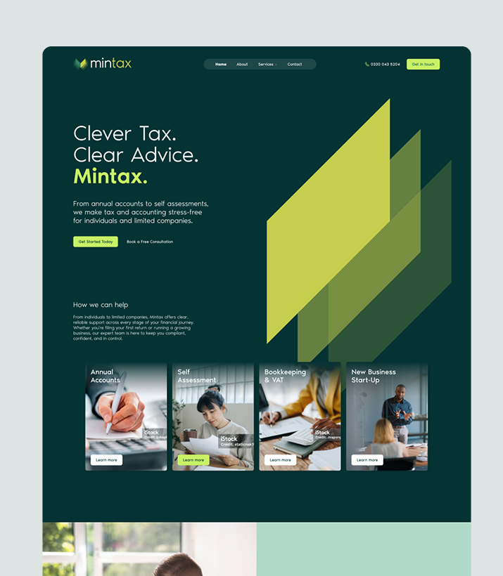 The result is a refined, confident brand and a clear, modern website that feels welcoming, trustworthy, and future-focused. One that supports growth, improves clarity, and positions Mintax as an accountancy partner built for today and tomorrow.